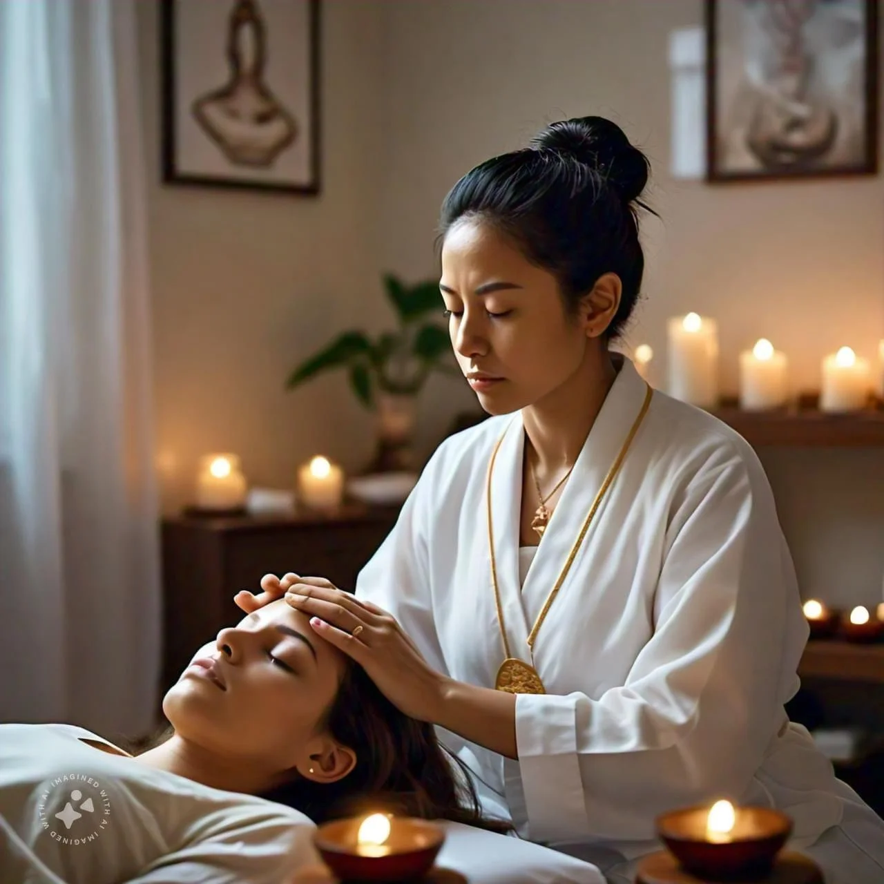 A woman receiving a massage or energy healing in a relaxing environment with candles and artwork in the background.