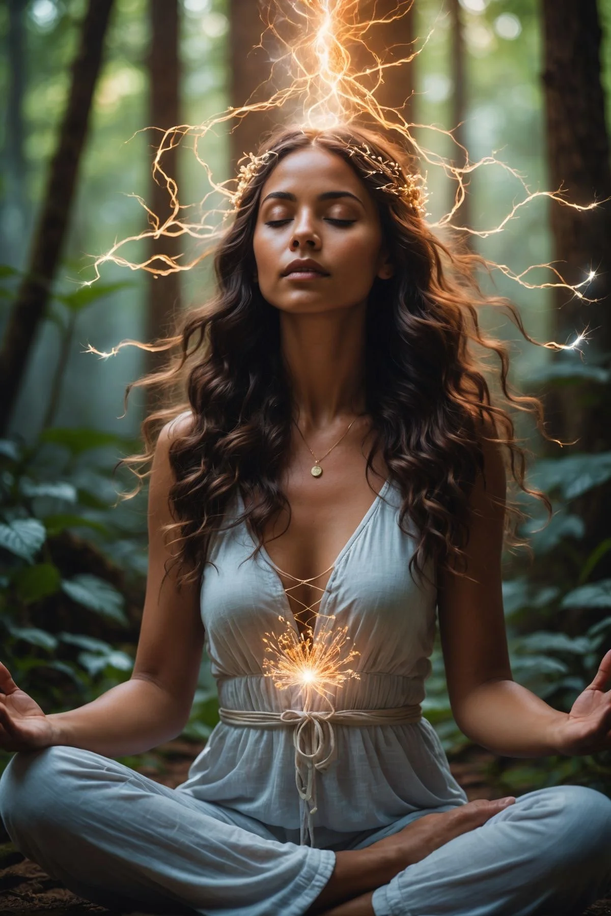 A woman sitting cross-legged in a forest meditation pose, with sparklers resembling electricity or lightning around her head and chest.