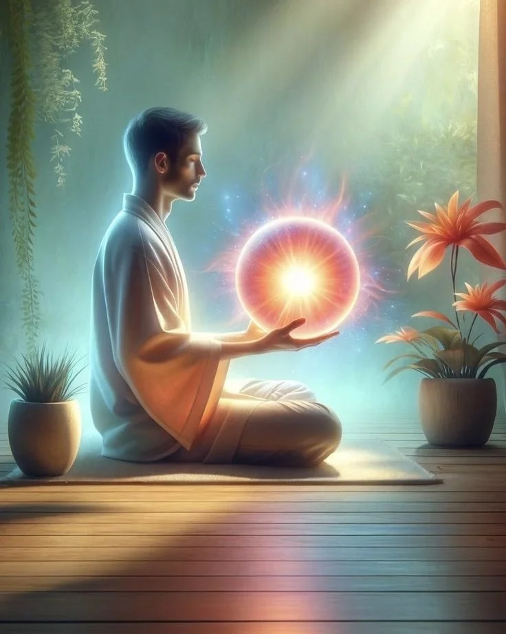 A person meditating indoors on a mat, holding a glowing, radiant orb with a bright center, surrounded by a colorful aura, with potted plants nearby and sunlight streaming in.